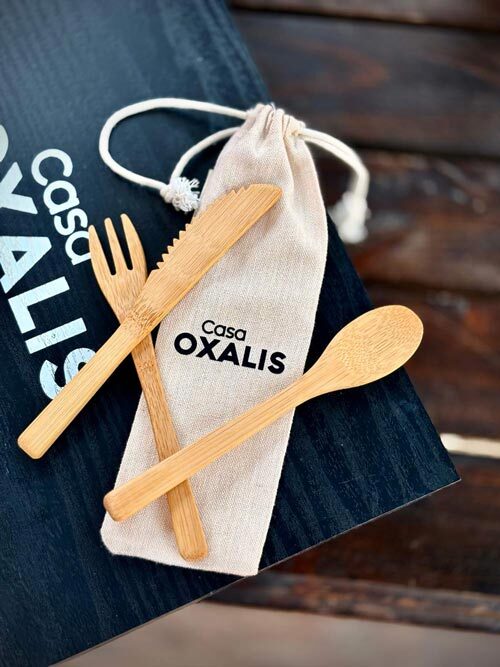 Set cubiertos bambú reutilizables / bolsa tela guardado